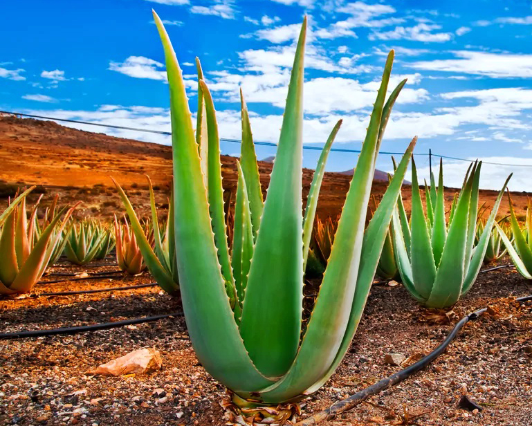 L’Aloès, communément appelé « Lys du Désert », pousse naturellement dans toutes les régions chaudes du globe. Environ 15 espèces d’aloès possèdent des propriétés médicinales. L’Aloe Vera est l’un des plus utilisés ainsi que l’Aloe arborescens, bien connu au Japon, au Portugal et au Brésil,
